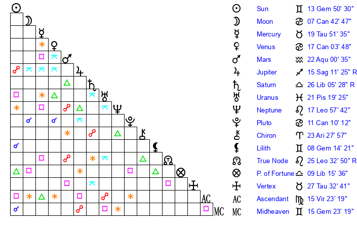 | Sun | 13 Gemini 50 | 14 Gemini 24 | 20 Virgo 41 |