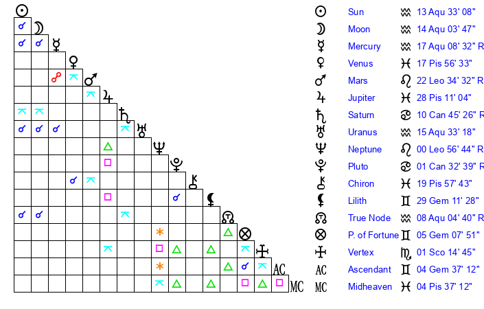 | Moon | 14 Aquarius 8 | 23 Aries 41 | 11 Aquarius 33 |
