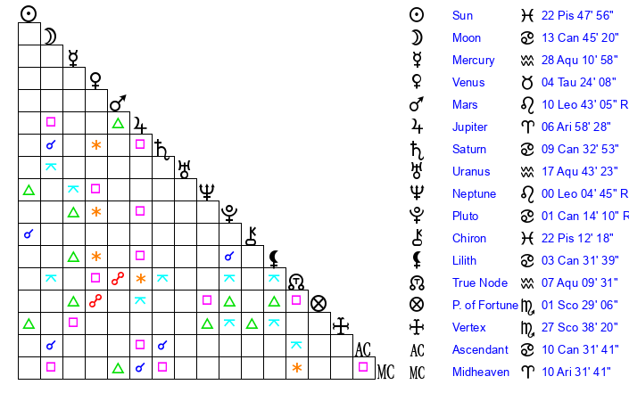 | Sun | 22 Pisces 48 | 23 Pisces 22 | 8 Cancer 31 |