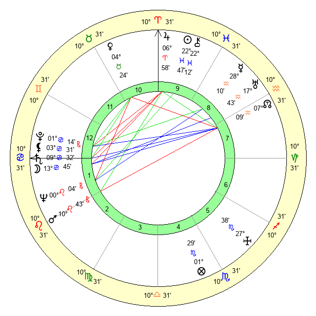 | Moon | 13 Cancer 42 | 16 Virgo 46 | 11 Cancer 20 |