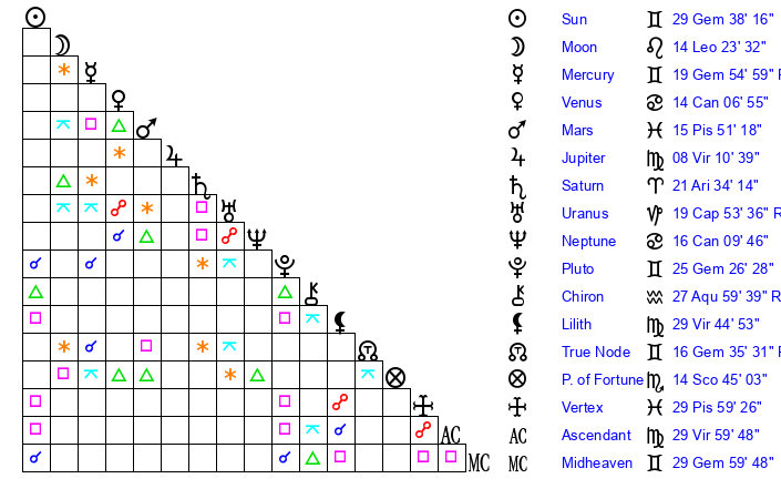 | Mars | 15 Pisces 53 | 2 Virgo 27 | 25 Pisces 58 |