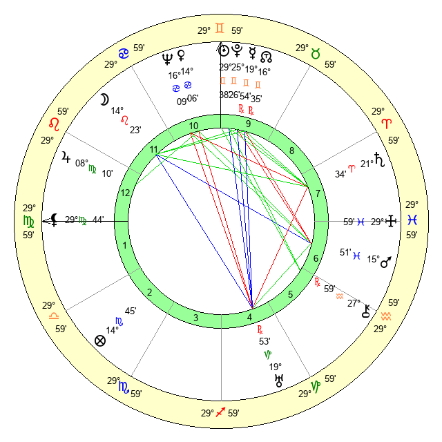 | Sun | 29 Gemini 39 | 0 Cancer 34 | 21 Libra 42 |