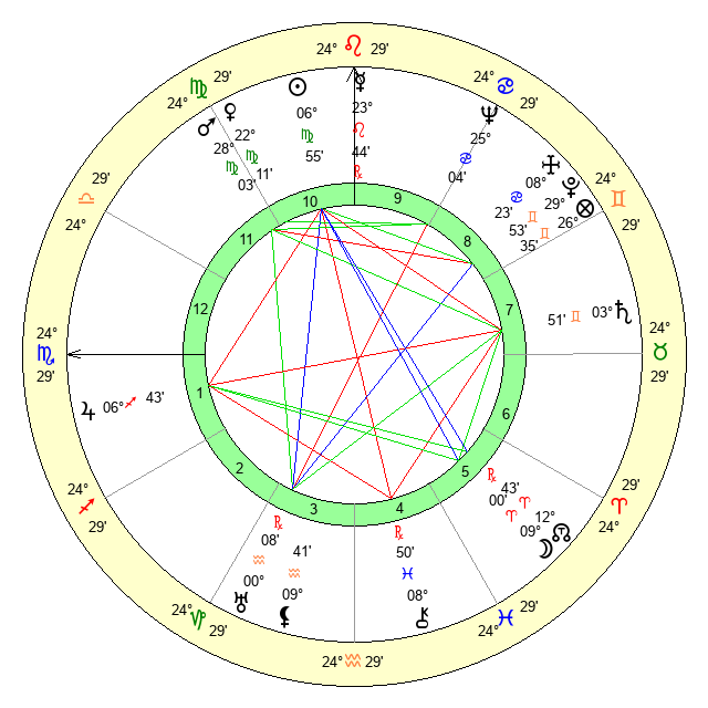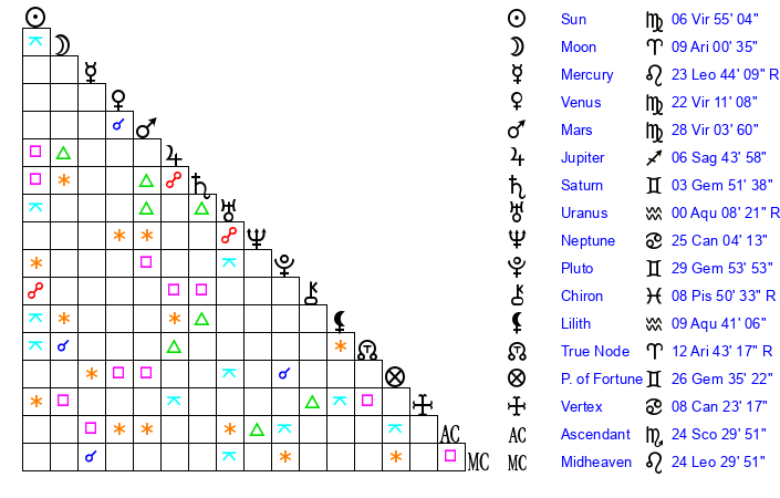 | Venus | 22 Virgo 12 | 6 Leo 0 | 10 Aquarius 31 |