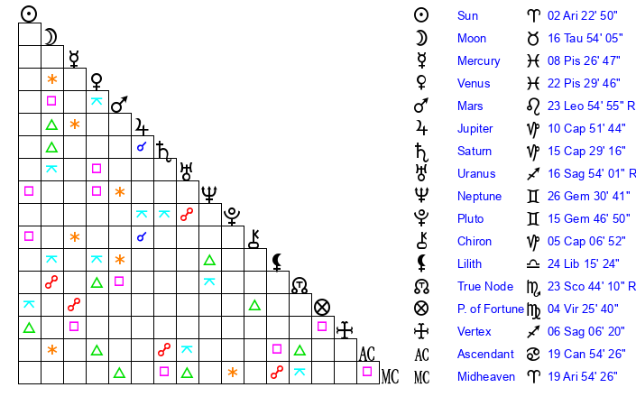 Moon | 16 Taurus 49 | 17 Capricorn 33 | 25 Scorpio 10 |