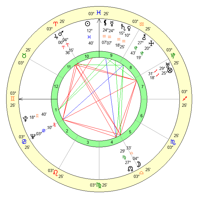 | Sun | 12 Pisces 41 | 13 Pisces 20 | 10 Cancer 18 |
