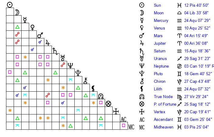 | Sun | 12 Pisces 41 | 13 Pisces 20 | 10 Cancer 18 |