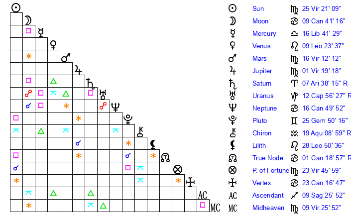 | Sun | 25 Virgo 21 | 26 Virgo 2 | 22 Capricorn 54 |