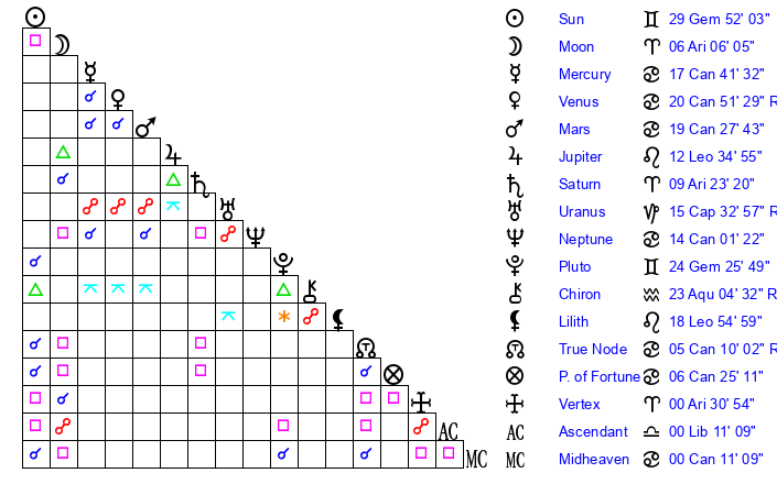 | Pluto | 24 Gemini 26 | 3 Aquarius 19 | 25 Gemini 46 |