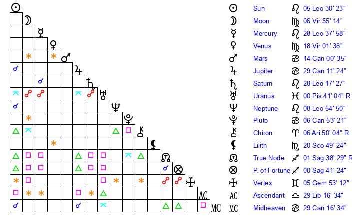 Moon | 6 Virgo 59 | 5 Libra 49 | 24 Cancer 27 |