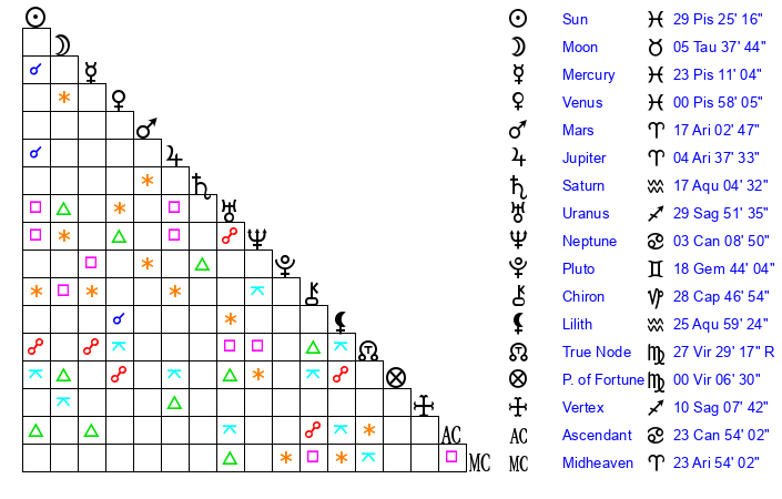 | Sun | 29 Pisces 25 | 0 Aries 5 | 26 Cancer 18 |