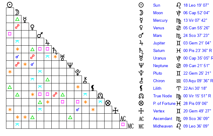 | Sun | 18 Leo 19 | 19 Leo 16 | 16 Sagittarius 59 |