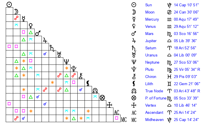 | Pluto | 25 Virgo 5 | 1 Aquarius 10 | 24 Virgo 7 |