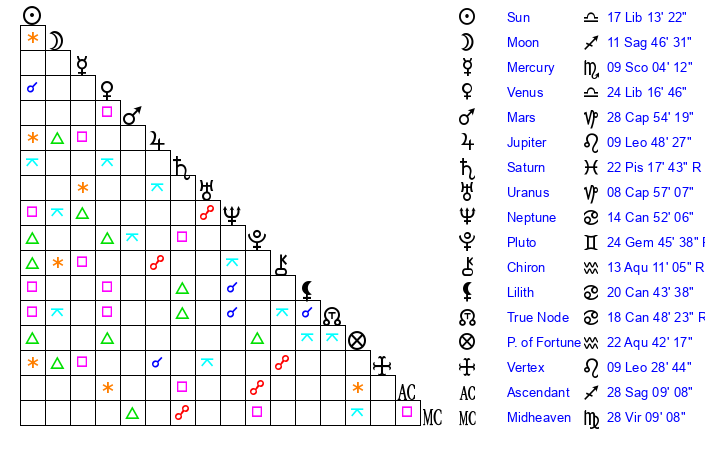 | Sun | 17 Libra 13 | 18 Libra 38 | 16 Aquarius 32 |