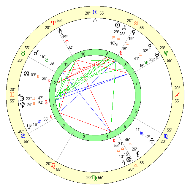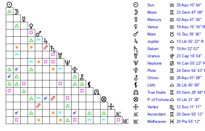 | Sun | 29 Aquarius 11 | 0 Pisces 17 | 21 Gemini 46 |