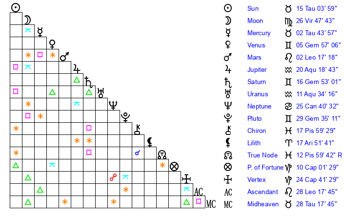 | Sun | 15 Taurus 4 | 16 Taurus 10 | 1 Virgo 23 |