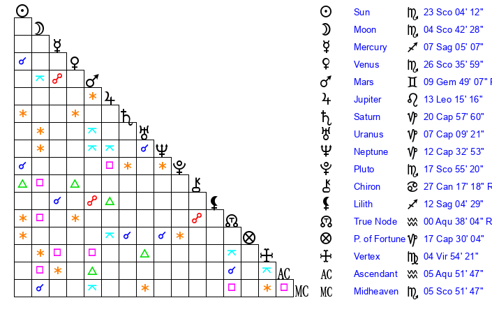 | Pluto | 17 Scorpio 55 | 29 Capricorn 55 | 19 Scorpio 12 |