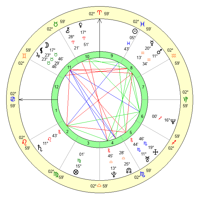 | Mars | 11 Aquarius 34 | 17 Cancer 1 | 18 Pisces 59 |