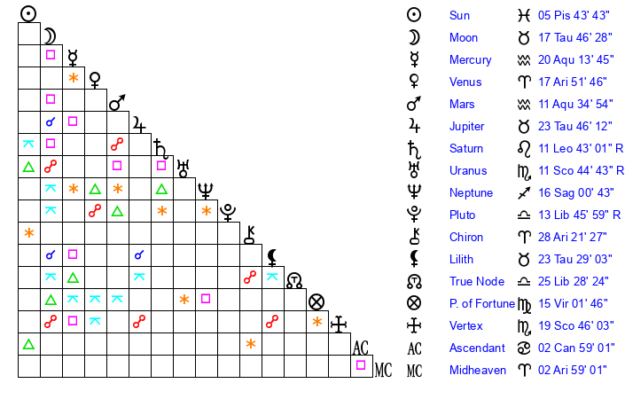 | Sun | 5 Pisces 44 | 6 Pisces 5 | 23 Aries 24 |