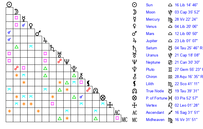 | Sun | 16 Libra 15 | 17 Libra 23 | 12 Aquarius 29 |