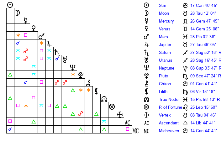 | Moon | 28 Taurus 5 | 4 Capricorn 16 | 27 Virgo 38 |