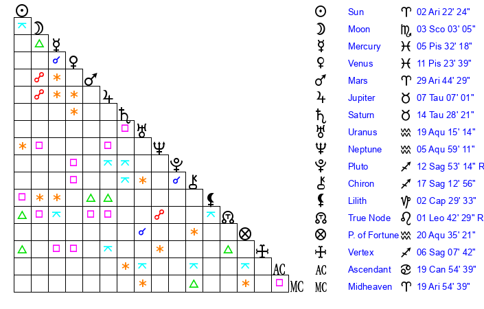 | Sun | 2 Aries 23 | 2 Aries 19 | 27 Aries 0 |