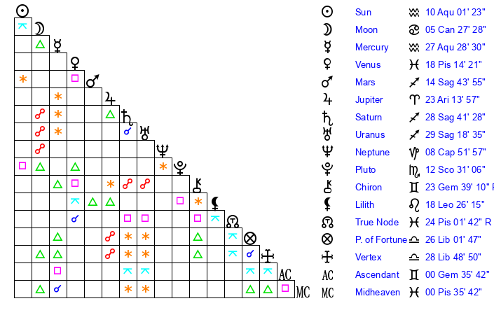 | Sun | 10 Aquarius 1 | 11 Aquarius 3 | 17 Pisces 21 |