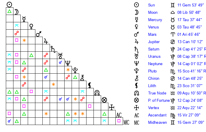| Sun | 11 Gemini 53 | 12 Gemini 24 | 15 Cancer 18 |