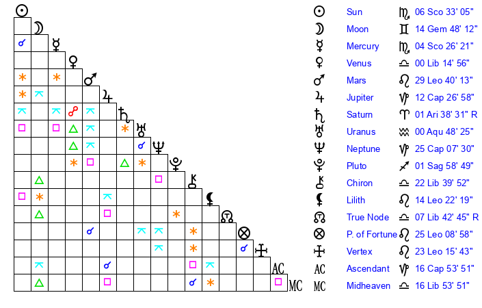 | Sun | 6 Scorpio 33 | 6 Scorpio 31 | 5 Sagittarius 44 |