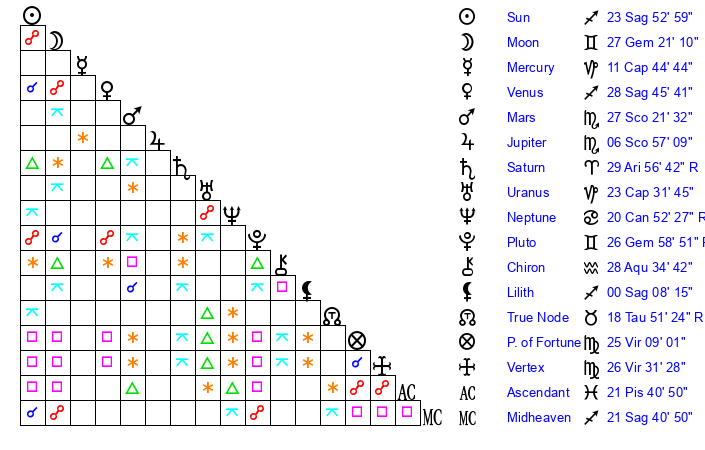 | Pluto | 26 Gemini 58 | 0 Aquarius 37 | 26 Gemini 3 |