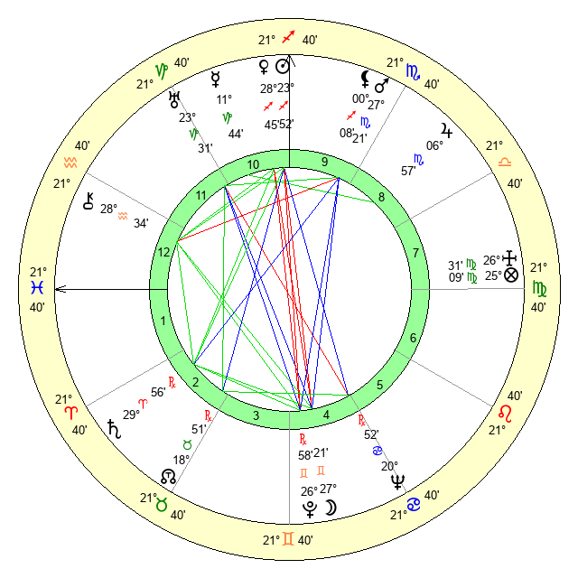 | Moon | 27 Gemini 24 | 12 Cancer 38 | 2 Virgo 34 |