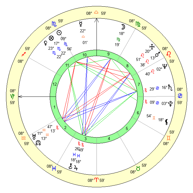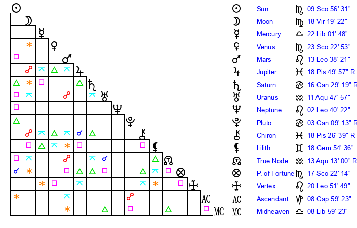 | Moon | 18 Virgo 18 | 2 Sagittarius 59 | 16 Virgo 24 |
