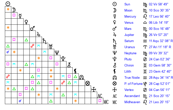 | Moon | 10 Scorpio 29 | 13 Libra 44 | 3 Aries 4 |