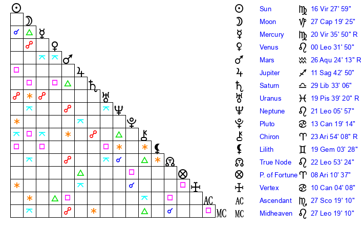 Moon | 27 Capricorn 17 | 9 Aries 46 | 27 Virgo 38 |