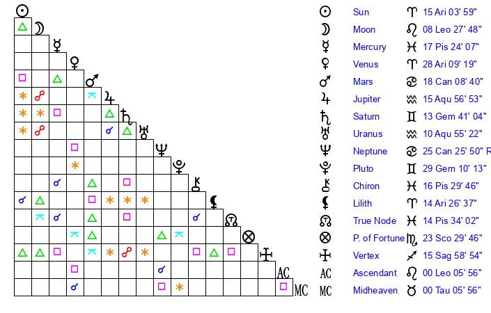 | Sun | 15 Aries 4 | 16 Aries 9 | 1 Leo 52 |