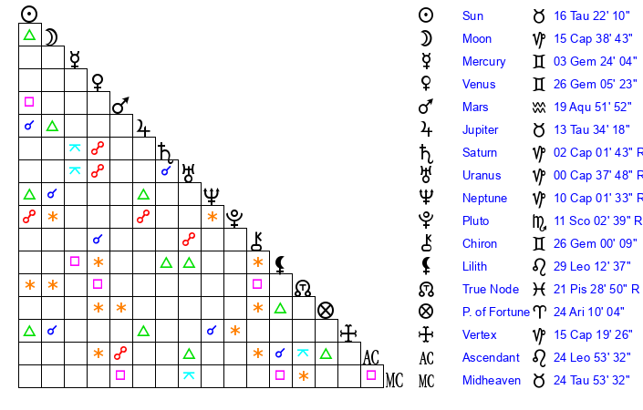 | Sun | 16 Taurus 22 | 16 Taurus 25 | 21 Gemini 55 |