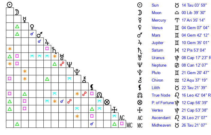 | Moon | 0 Libra 44 | 26 Leo 7 | 19 Aquarius 27 |