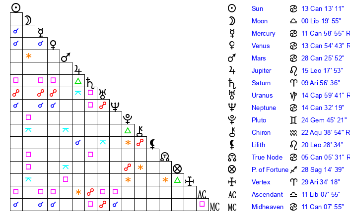 | Sun | 13 Cancer 13 | 13 Cancer 55 | 6 Scorpio 53 |