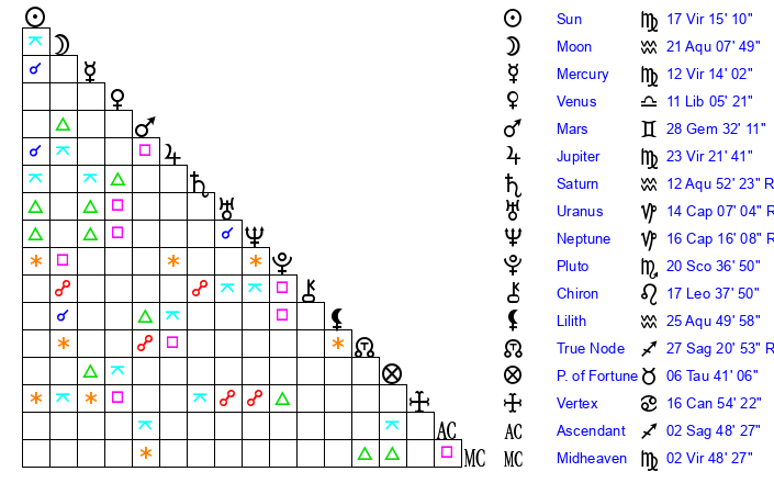 | Sun | 17 Virgo 15 | 17 Virgo 16 | 19 Libra 37 |