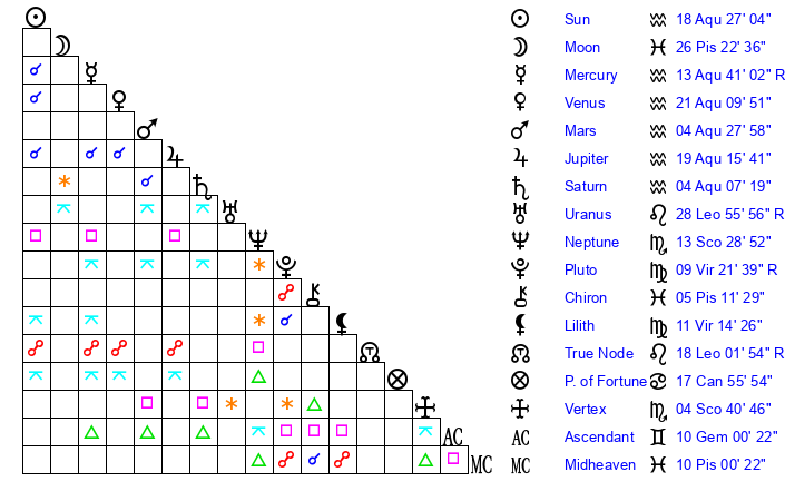 | Sun | 18 Aquarius 27 | 19 Aquarius 10 | 21 Aries 19 |