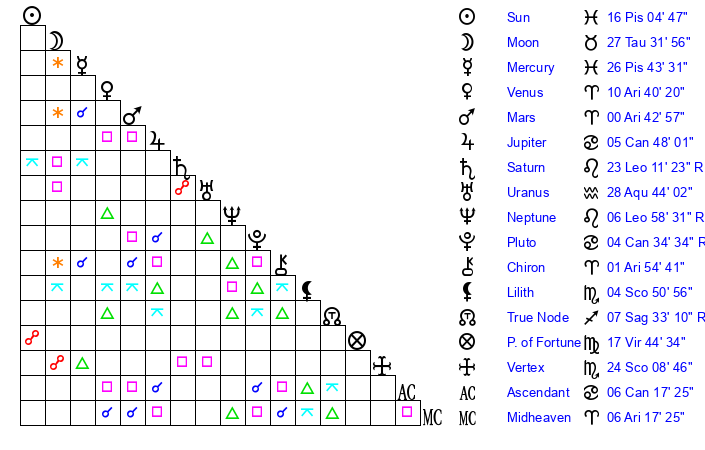 Venus | 10 Aries 40 | 10 Aries 10 | 14 Leo 6 |