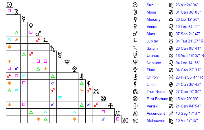 | Sun | 26 Virgo 24 | 27 Virgo 0 | 15 Capricorn 50 |