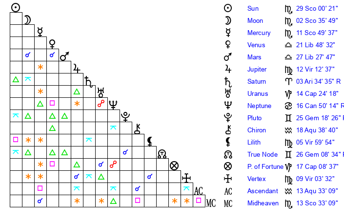 | Sun | 29 Scorpio 1 | 29 Scorpio 53 | 26 Pisces 28 |