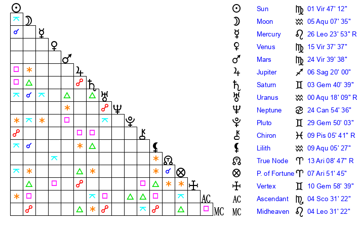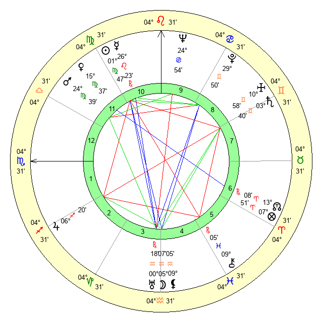 | Mercury | 26 Leo 24 | 15 Leo 38 | 8 Sagittarius 52 |