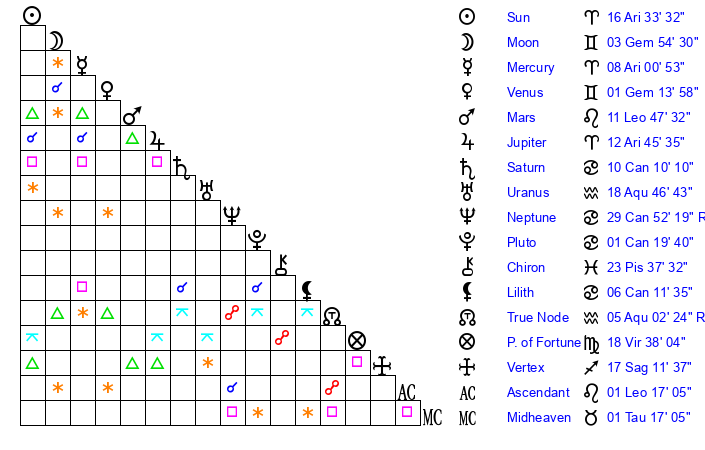 | Sun | 16 Aries 33 | 17 Aries 8 | 1 Leo 25 |
