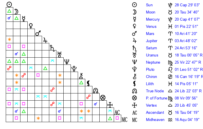 | Moon | 20 Taurus 32 | 6 Libra 37 | 0 Cancer 30 |