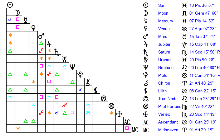 | Sun | 10 Pisces 37 | 11 Pisces 22 | 18 Gemini 19 |