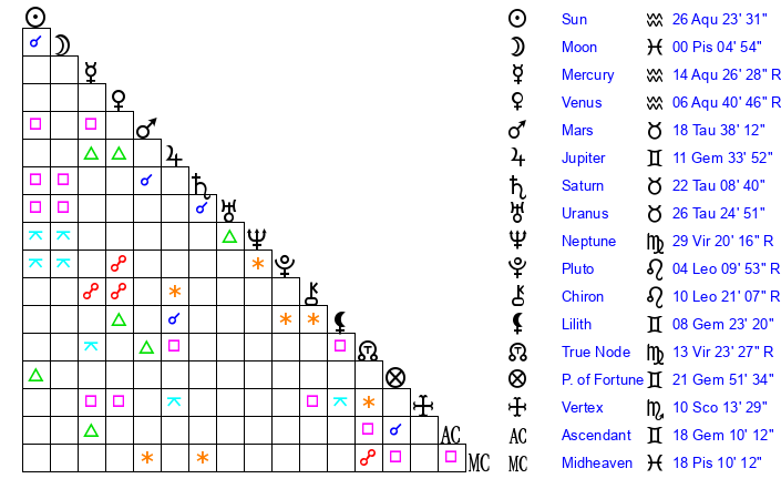 | Sun | 26 Aquarius 24 | 27 Aquarius 16 | 18 Taurus 25 |