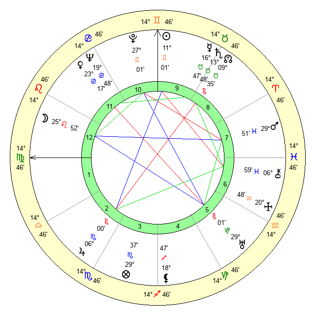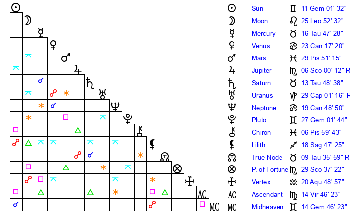 Sun | 11 Gemini 1 | 12 Gemini 24 | 0 Libra 31 |