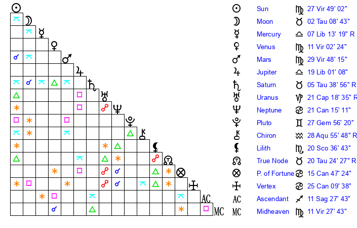 | Venus | 11 Virgo 3 | 2 Virgo 40 | 5 Aquarius 13 |