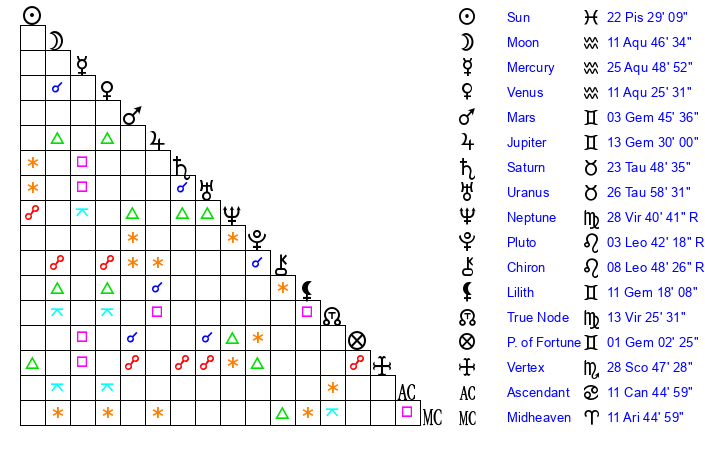 | Sun | 22 Pisces 29 | 23 Pisces 22 | 13 Gemini 25 |